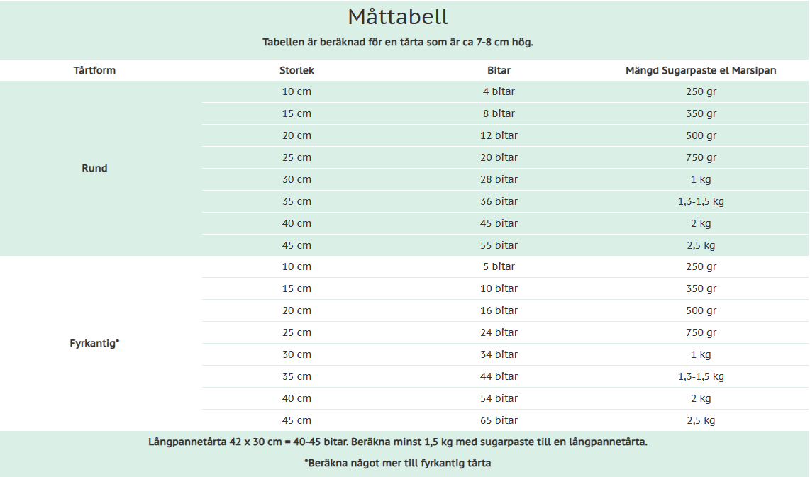 När du skall klä din tårta med sugarpaste eller marsipan är det viktigt att du inte kavlar för tunt, 3-4 mm är lagom. Kavlar du för tunt syns alla ojämnheter, det blir väldigt mycket veck och du har ingenting att sträcka i utan att det går sönder. Med detta i åtanke kan man följa nedanstående ca-tabell. Med denna beräkning får du lite över som du kan använda till kantdekorationer runt tårtan.