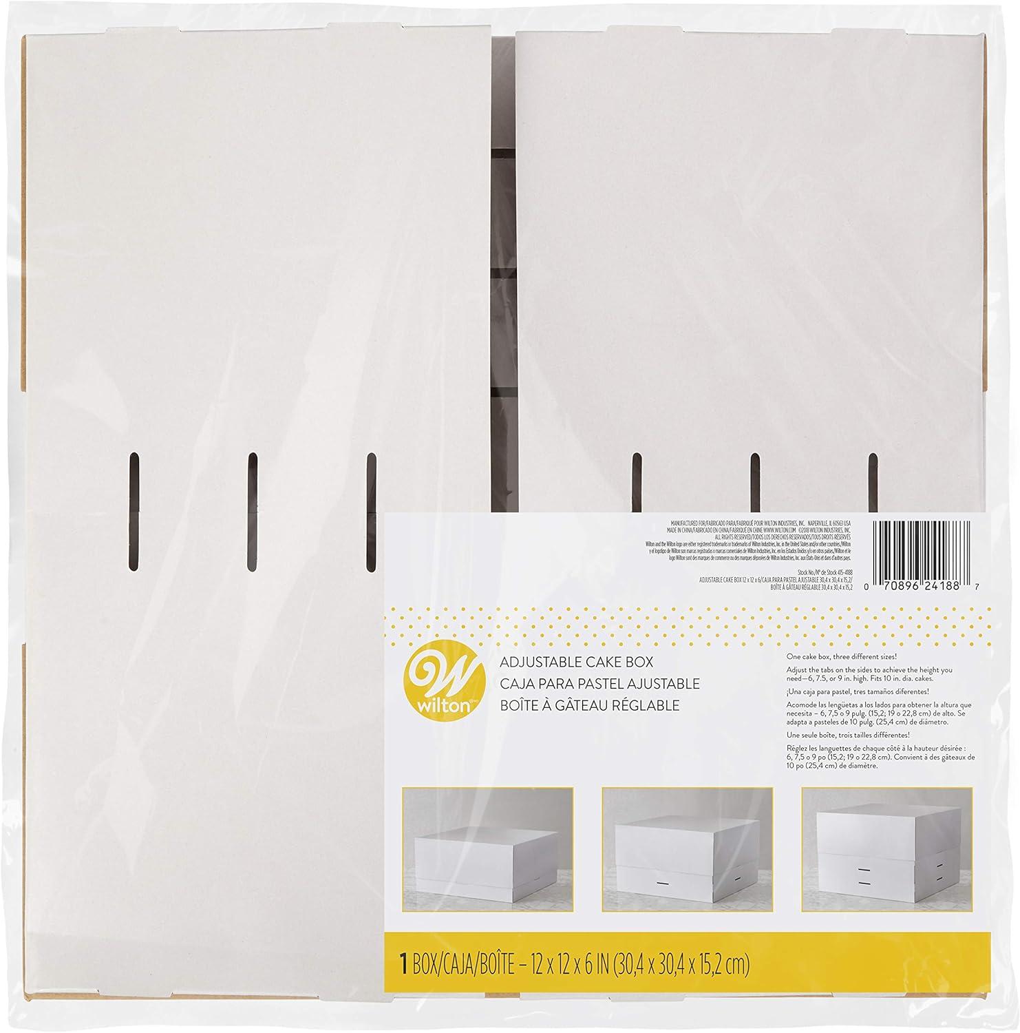 Justerbar tårtkartong. Perfekt för att hålla en tårta med en diameter på ca 25cm. Den här lådan anpassar sig till den höjd du behöver, så att toppen av din tårta skyddas från att kladda och stötas till. Flikarna på sidan av lådan hjälper dig att uppnå den höjd du behöver. Lätt att montera, lådan i kraftig kartong kommer med en utfällbar botten och ett utfällbart lock. För extra stöd, lägg din tårta på en cakeboard (säljs separat) innan du lägger den i kartongen. Den här tårtkartongen är också idealisk för att frakta andra sötsaker, som cupcakes, scones, muffins, bröd, kakor, godis med mera.