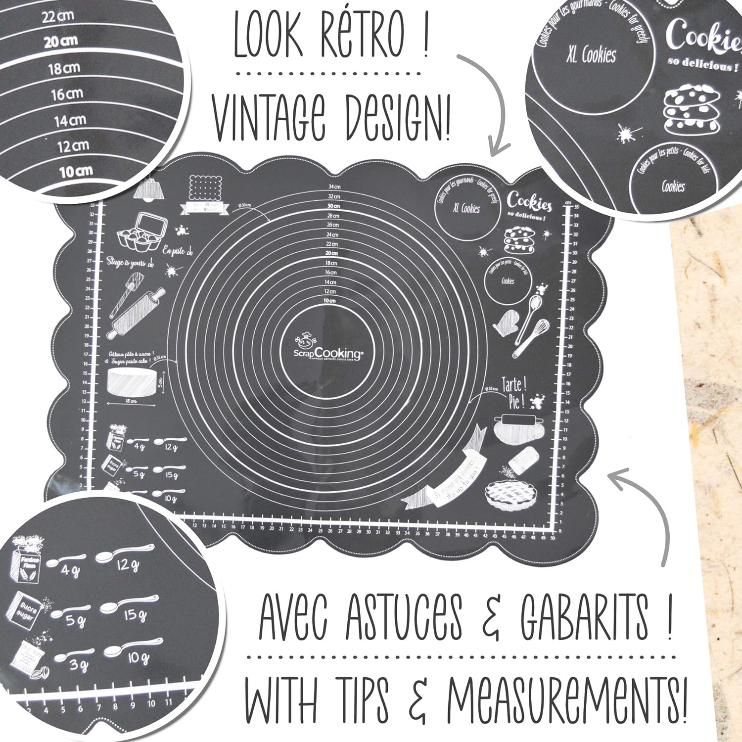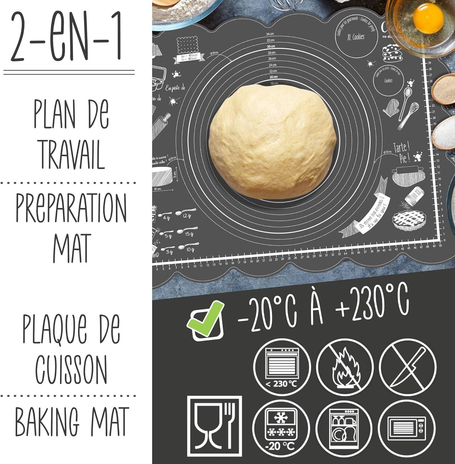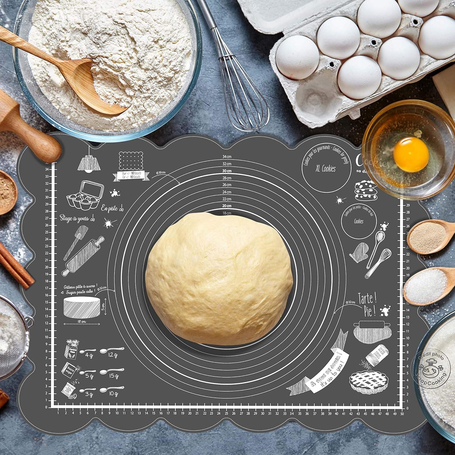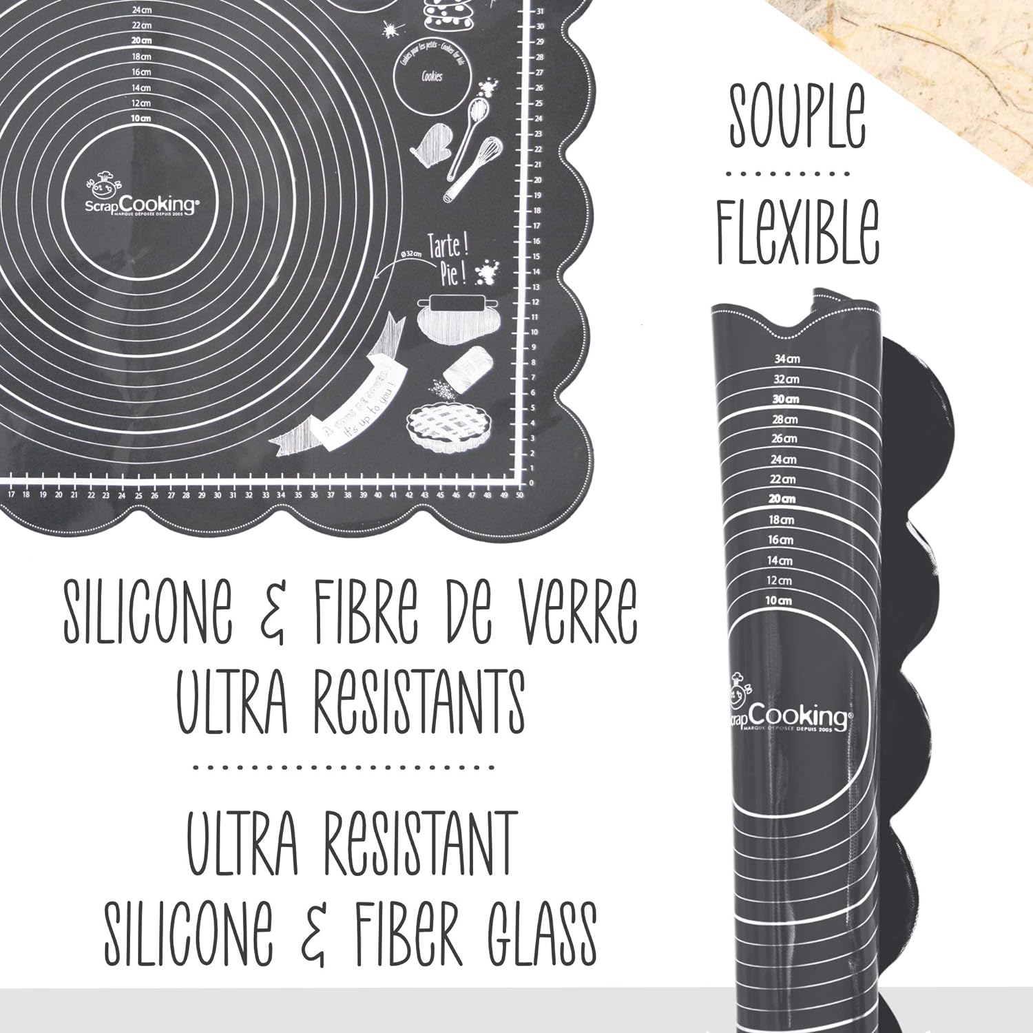 Ultrasmidig, halkfri bakmatta i silikon från Scrapcooking. Få ut det mesta av alla tips och tricks på denna matta: perfekt storlek för att täcka en tårta med sugarpaste/marsipan, en bakverksguide, kakmall, guide för att mäta ingredienser i teskedar och matskedar, etc.