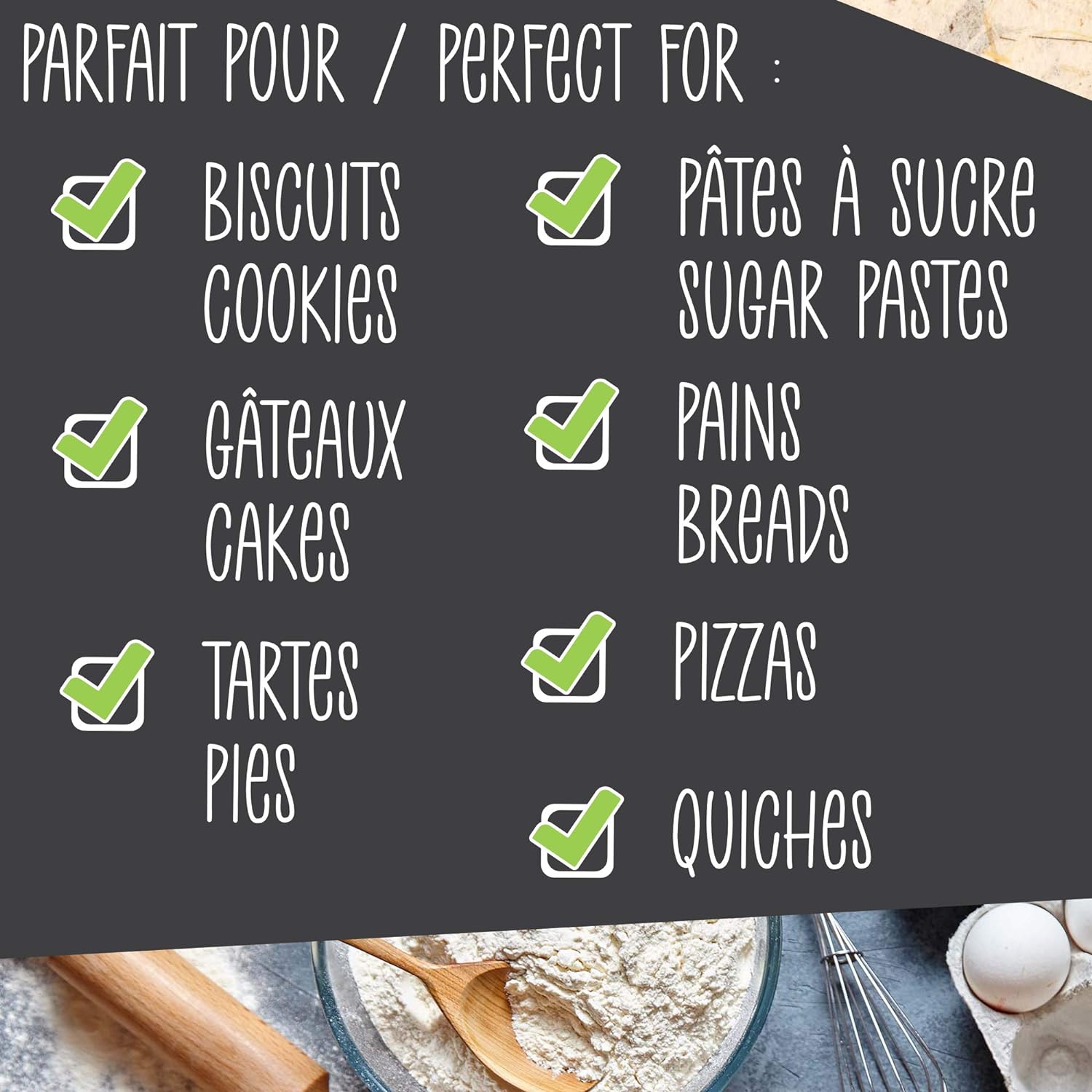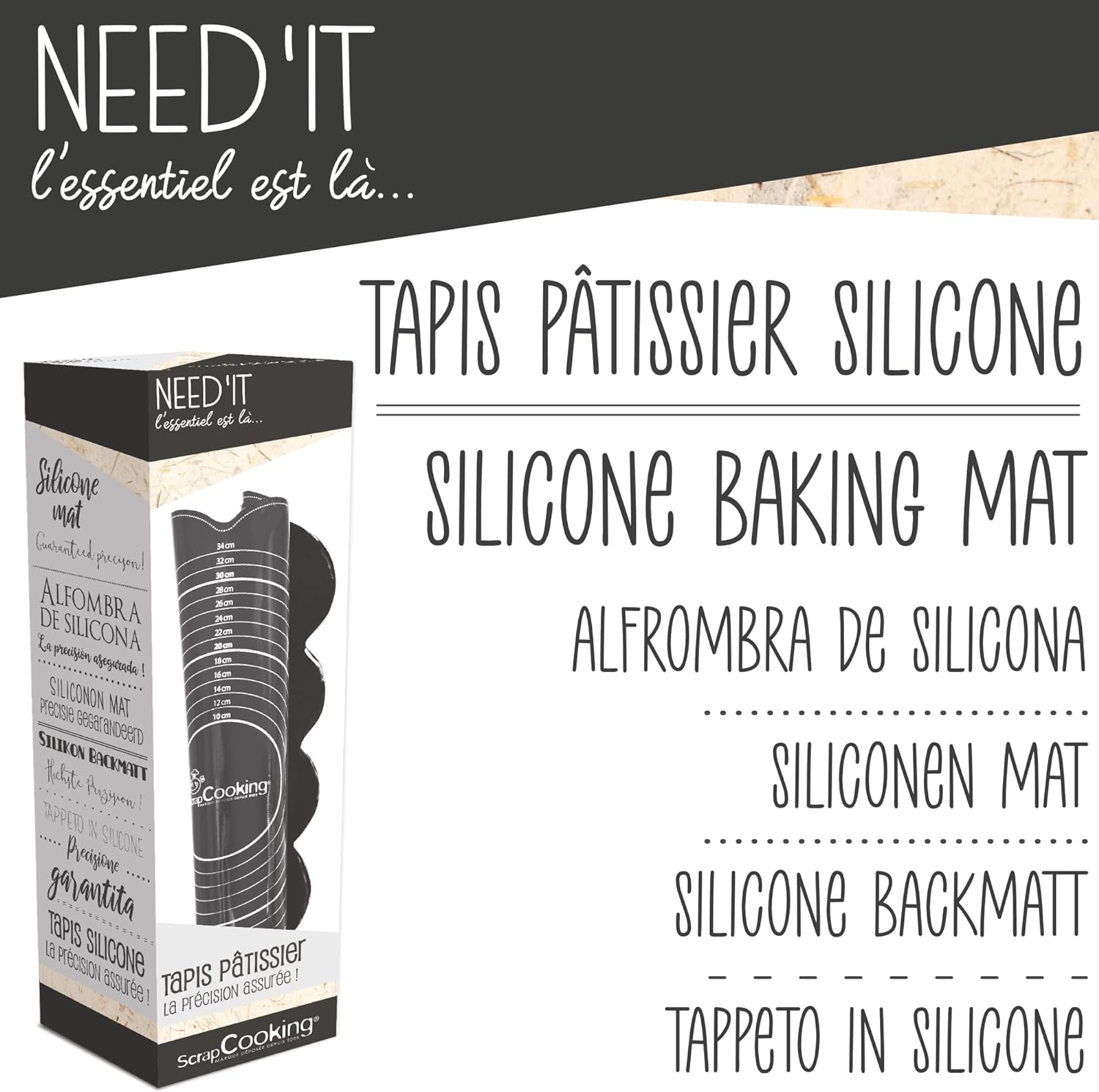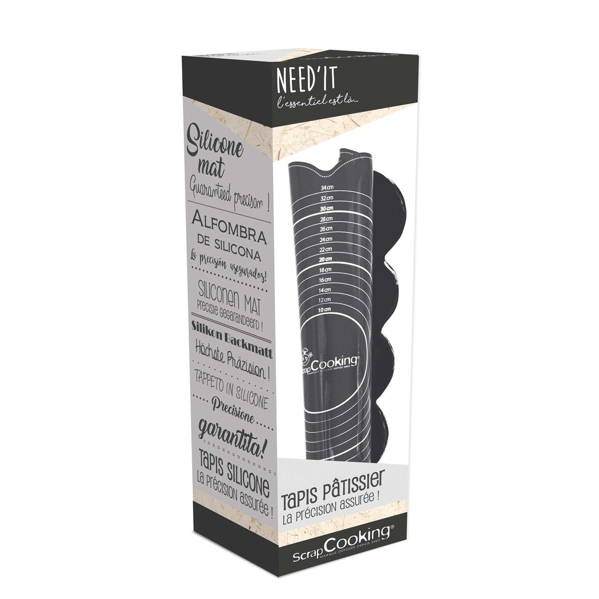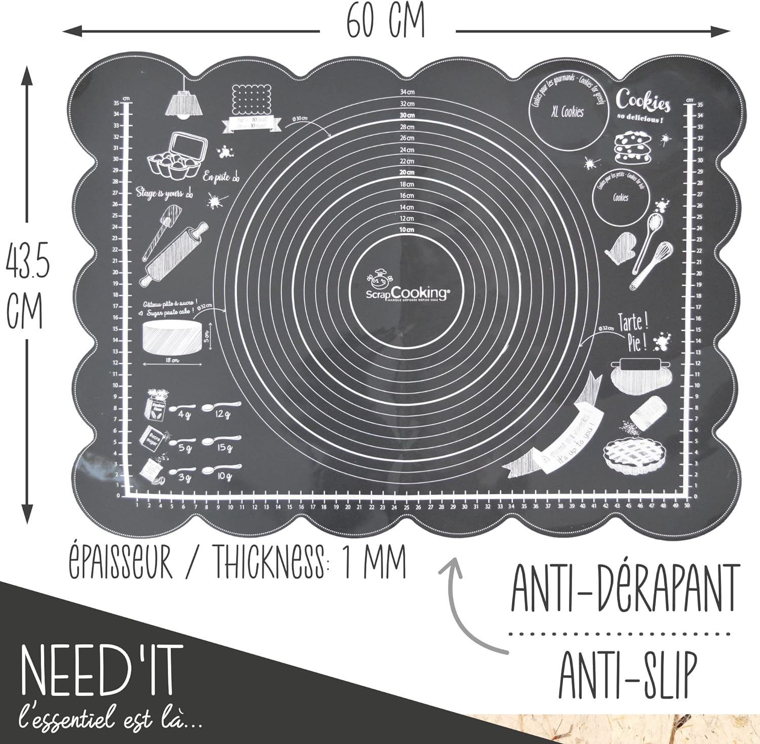 Ultrasmidig, halkfri bakmatta i silikon från Scrapcooking. Få ut det mesta av alla tips och tricks på denna matta: perfekt storlek för att täcka en tårta med sugarpaste/marsipan, en bakverksguide, kakmall, guide för att mäta ingredienser i teskedar och matskedar, etc.