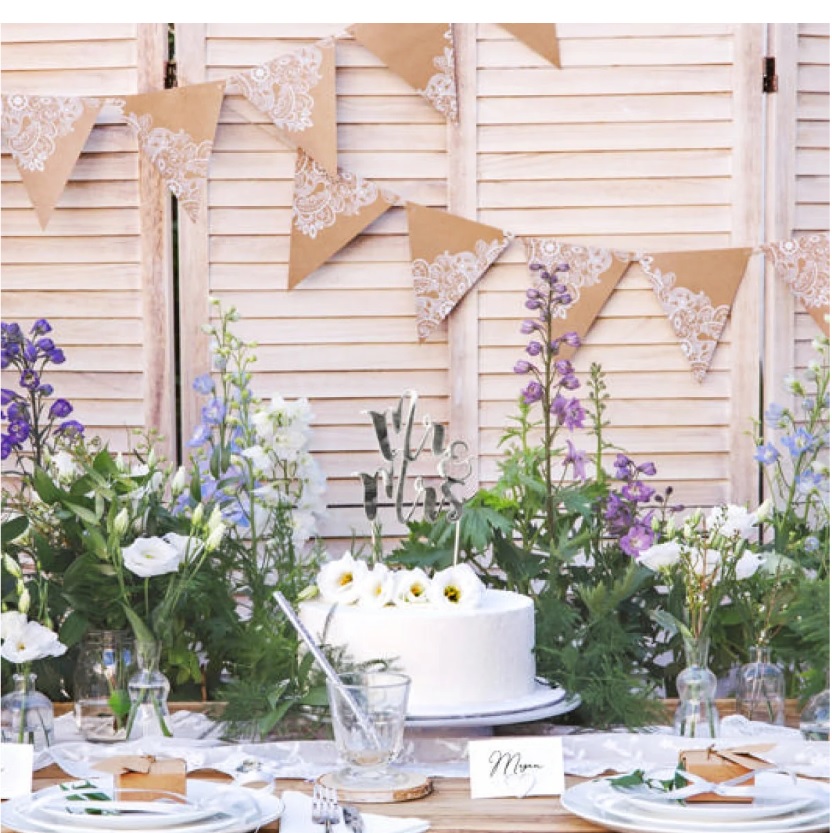 Naturfärgad vimpel med vita detaljer som passar till bröllop och fester. Häng vimpeln vid ingången för att gästerna ska känna sig välkomna när dom kommer på bröllopet eller festen.